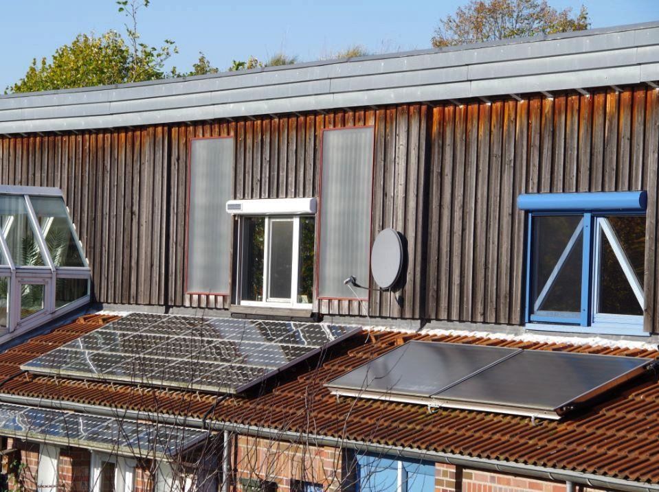 Einige Bewohner/innen erwärmen über thermische Solaranlagen ihr Warmwasser und nehmen die Sonnenwärme über maximal 400 Liter große Pufferspeicher auch in sonnenarme Tage mit hinüber.